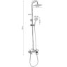 Душевая стойка с присоединением к корпусу смесителя и дополнительным креплением к стене и большой круглой лейкой с эффектом тропического душа.