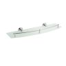 Прямоугольная полка под зеркало из матового стекла толщиной 5 ммс полированными краями о которые невозможно порезаться, с надежной фиксацией к стене с помощью крепления из металла с хромированным покрытием.