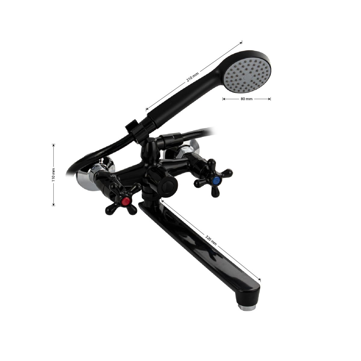 Габаритные размеры: ширина 150 мм, высота корпуса 110 мм, длина излива 320 мм, душевая лейка d = 80 мм, шланг 150 см, диаметр чашки 65 мм.